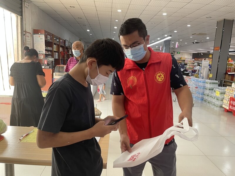 鲁网8月25日讯 “你好大姐,请看一下我们的‘学习强国’APP,可以在上面看新闻、看视频、听戏曲,还可以累计积分兑换强国商城商品呢。”8月23日,寅寺镇新时代文明实践志愿者们拿着带有“学习强国”二维码的手提袋,正在向前来超市购物的居民推广“学习强国”。