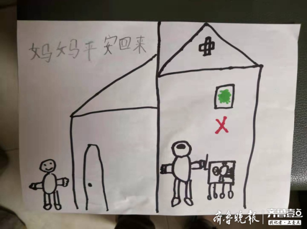 1月31日晚上9点多,项少黎下班回到家,6岁大的儿子已经睡了,母子俩又没有说上话。桌上的一幅画吸引了她的注意,画中两间房子被一堵墙间隔开,左边是笑脸相迎的娃娃,右边是医院里穿着防护服只露出眼睛,正在救治患者的妈妈,6个大大的字体写着“妈妈平安回来”。