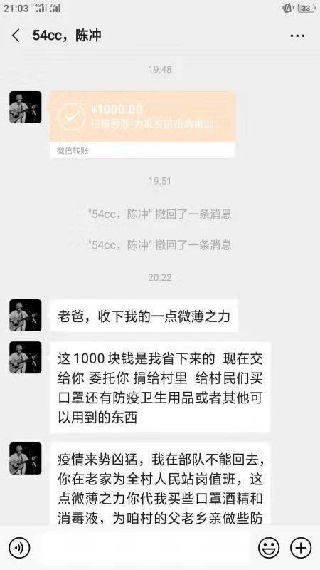 “老爸,收下我的一点微薄之力,这1000元钱是我省下的,现在委托你,捐给村里,给村里买口罩或者防疫用品或者其他可以用到的东西。”2日19点50分许,正在村口防疫值守点值班的汶上县康驿镇陈街村支部书记陈月广,收到正在部队服役儿子陈冲连发的几条微信。