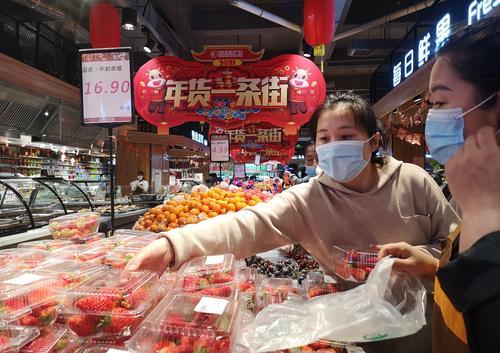 记者走访城区一些超市发现,肉食、海货、水果、零食……无论大人还是孩子,都是大包小包往家拎。亿沣超市相关负责人王书娟介绍,年货现已准备得很充分,为应对春节高峰期,米面、粮油、酒水、干果、糖食等春节集中销售的民生商品应有尽有。