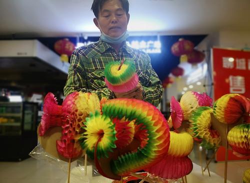 市民周百波在香江一期经营喜庆用品。他说,虽然疫情还在,但政府的防控措施很到位,咱们聊城现在是一片祥和,今年可以好好过一个春节了。在金鼎商厦六楼,以非遗项目为主的年货一条街已开张三四天,民间艺人王柏旺写完春联又做手掌画,还向顾客介绍糖画、翻花等艺术品,一直忙个不停。聊城百大金鼎企划总监李桂华告诉聊城晚报全媒体记者,年货购物中心广场既有吃的、喝的,还有玩的。