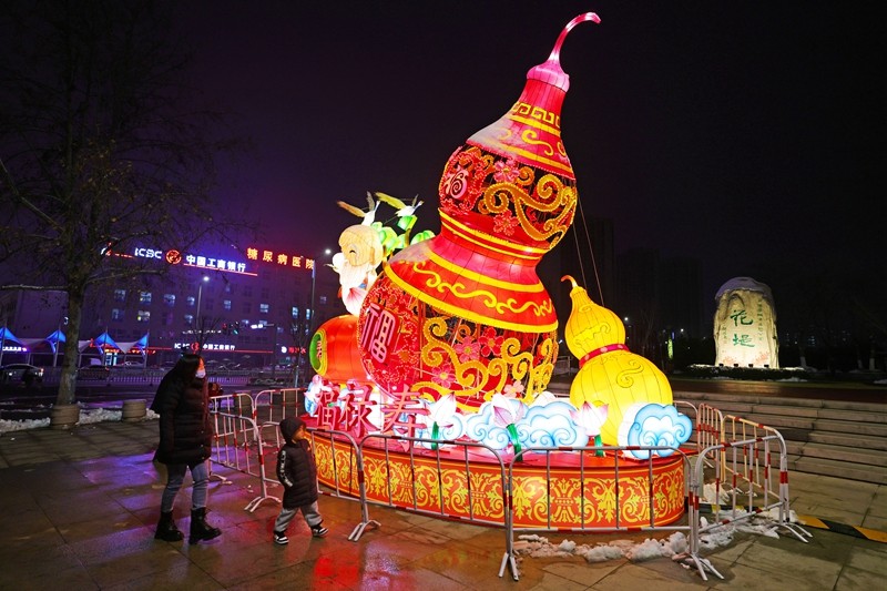 东昌路、二干路路口的一组葫芦造型的花灯。