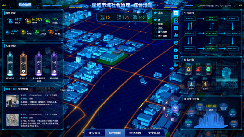 智慧网格,构建市域治理“全新生态”。聊城市通过“划网格、建队伍、搭平台、促运行”,大力创新“党建+网格”智能新模式。目前,全市共划分基础网格7863个,专属网格2100个,配备专兼职网格员8043名,城市社区全部实现了“一网格一专职”,网格员使用手机APP,可随时上报事件,再由系统分流到相关部门进行处理,打通了“服务群众最后一公里”。