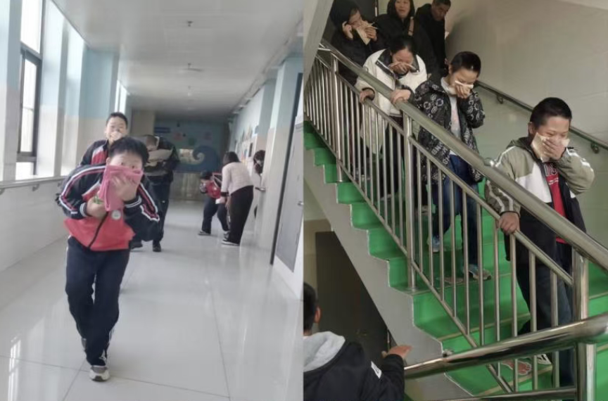 随着警报响起,学生及部分陪读家长在老师的带领下,用提前准备好的湿毛巾躬身撤离,按照事先熟悉过的逃生路径,迅速而有序地从教室奔向集合场地。