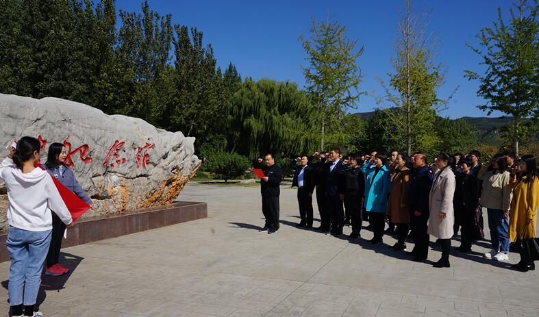 随后,全体人员在纪念馆前面向党旗郑重宣誓,再一次重温入党誓词。