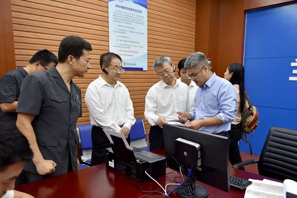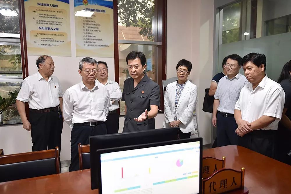 郑学林庭长一行边看演示边与诉讼群众交流,在听到兰山法院7月份以来网上立案数量已达到民商事立案数量的51%,且群众对该院的创新服务举措非常满意后,郑庭长频频点头表示认可。