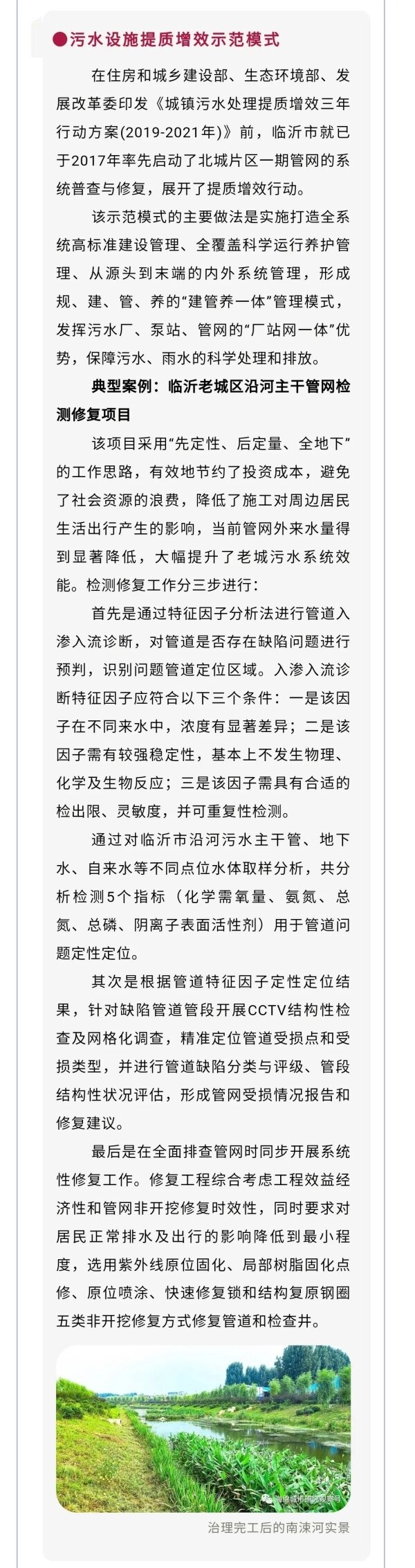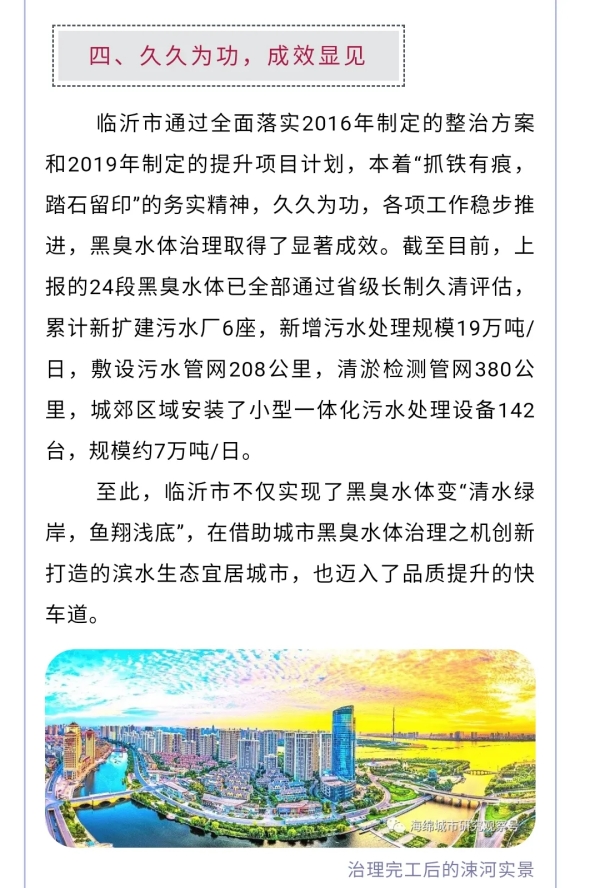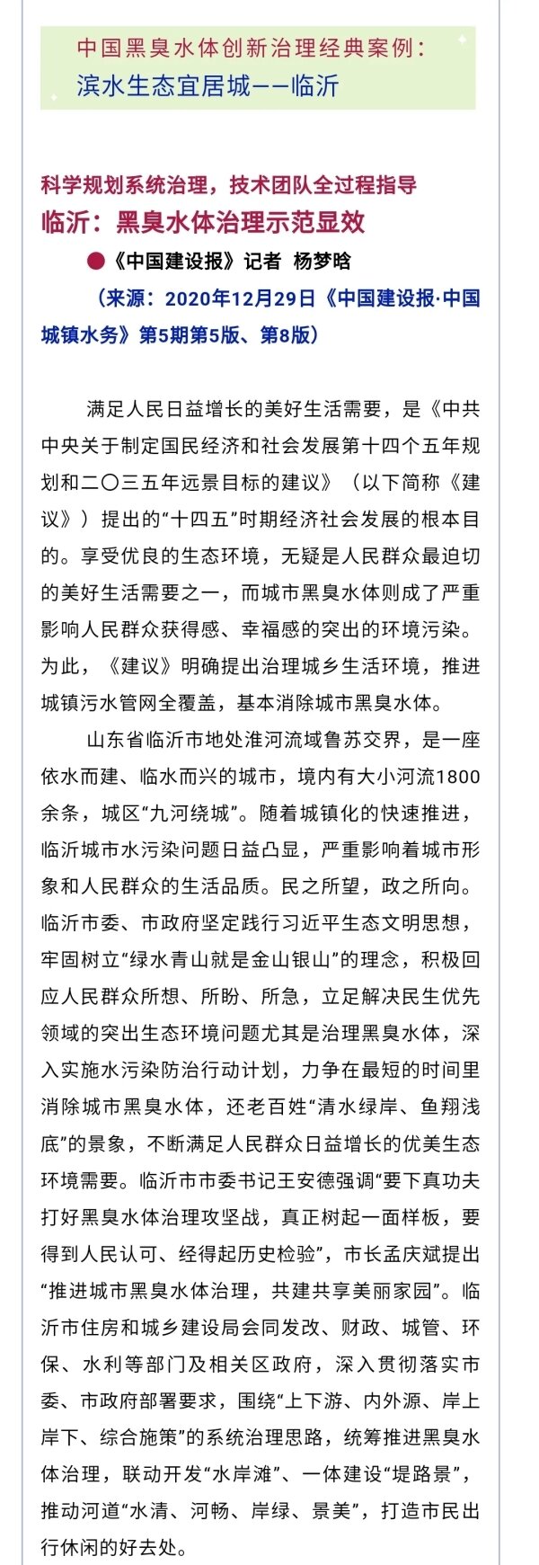鲁网1月2日讯 近年来,临沂市住建局在市委、市政府的坚强领导下,围绕“上下游、内外源、岸上岸下、综合施策”的系统治理思路,统筹推进黑臭水体治理,推动河道“水清、河畅、岸绿、景美”,打造市民出行休闲的好去处。12月29日,《中国建设报 中国城镇水务》第5期第5版、第8版刊登了临沂市黑臭水体治理的先进经验和做法。现将全文转发,以飨读者。