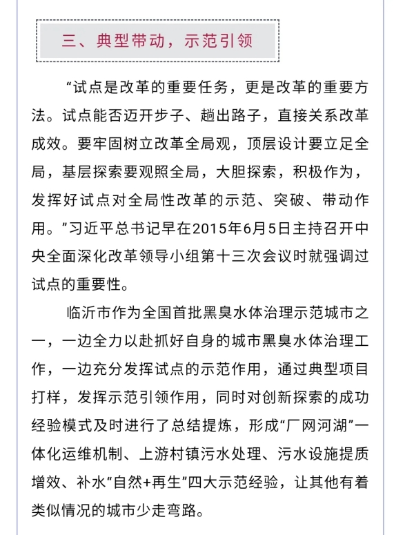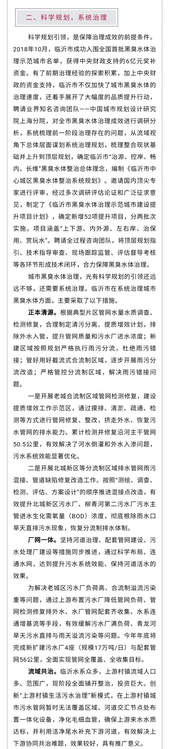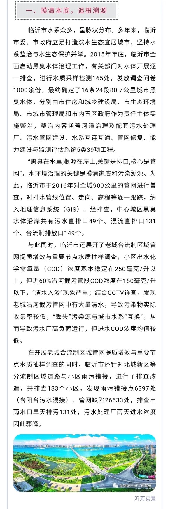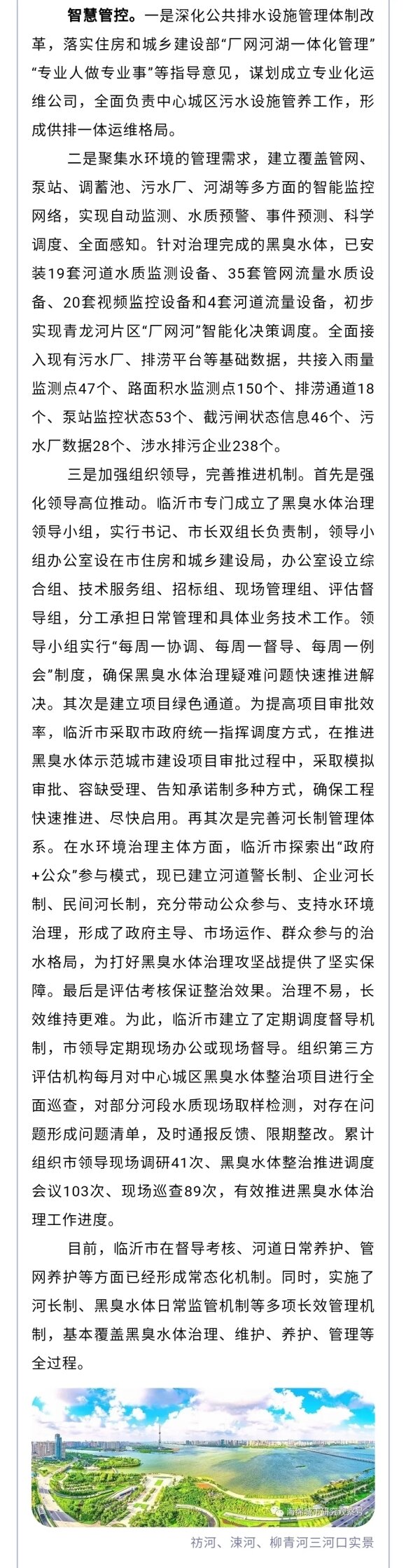 鲁网1月2日讯 近年来,临沂市住建局在市委、市政府的坚强领导下,围绕“上下游、内外源、岸上岸下、综合施策”的系统治理思路,统筹推进黑臭水体治理,推动河道“水清、河畅、岸绿、景美”,打造市民出行休闲的好去处。12月29日,《中国建设报 中国城镇水务》第5期第5版、第8版刊登了临沂市黑臭水体治理的先进经验和做法。现将全文转发,以飨读者。