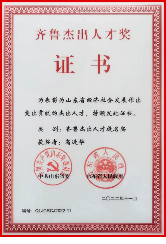 据了解,“齐鲁杰出人才奖”是中央批准设立的表彰项目,是省委、省政府颁发的旨在奖励为山东省经济社会发展做出卓越贡献人才的荣誉奖项。齐鲁杰出人才奖每3年评选一次,每次评选不超过2人,同时设置齐鲁杰出人才提名奖,每次评选不超过10人,获奖者由省委、省政府颁发荣誉证书和奖金。