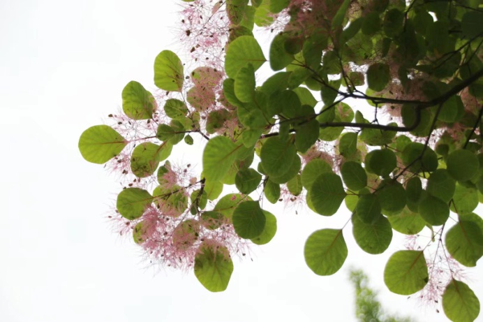 黄栌秋色黄栌的花期,为每年的二月到五月。初夏时节,黄栌开黄绿色小花,花序为圆锥状,粉红色羽毛状的花梗,久留不落,远远望去,开花的黄栌树上,就像是一团淡淡的粉色烟雾在枝头形成似云似雾的景观,如梦如幻,形成朦胧的“烟雾”形象,历来被文人墨客比作“叠翠烟罗寻旧梦”和“雾中之花”,故黄栌又有“烟树”之称。