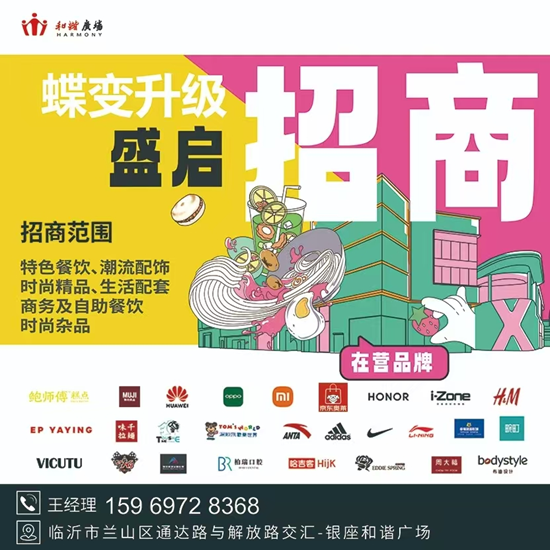 临沂和谐广场,建筑面积14万㎡,是临沂首家大型商业综合体,自2012年开业以来便吸引了无数目光。现临沂和谐广场蝶变升级·盛启招商中,招商范围:特色餐饮、潮流配饰、时尚精品、生活配套、商务及自助餐饮时尚品牌。