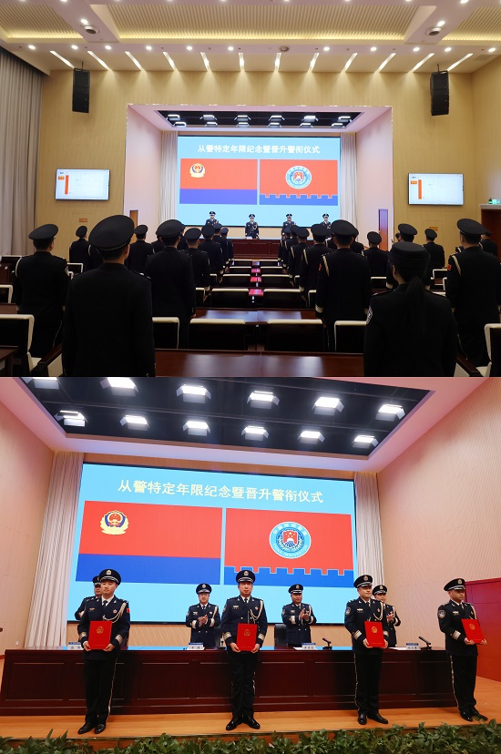 从警特定年限暨人民警察警衔晋升仪式在庄严的国歌声中开始。期间,宣读了光荣从警特定年限人员名单、民警晋升警衔命令,站党委成员分别为他们颁发了从警特定年限荣誉水晶、警衔标志。随后,民警代表上台作表态发言,表示将以此次警衔晋升为契机,以更加昂扬的斗志、更加饱满的热情、更加务实的作风投入到下一步工作中,为自己的从警生涯添彩,为临沂边检工作现代化做出新的更大贡献。