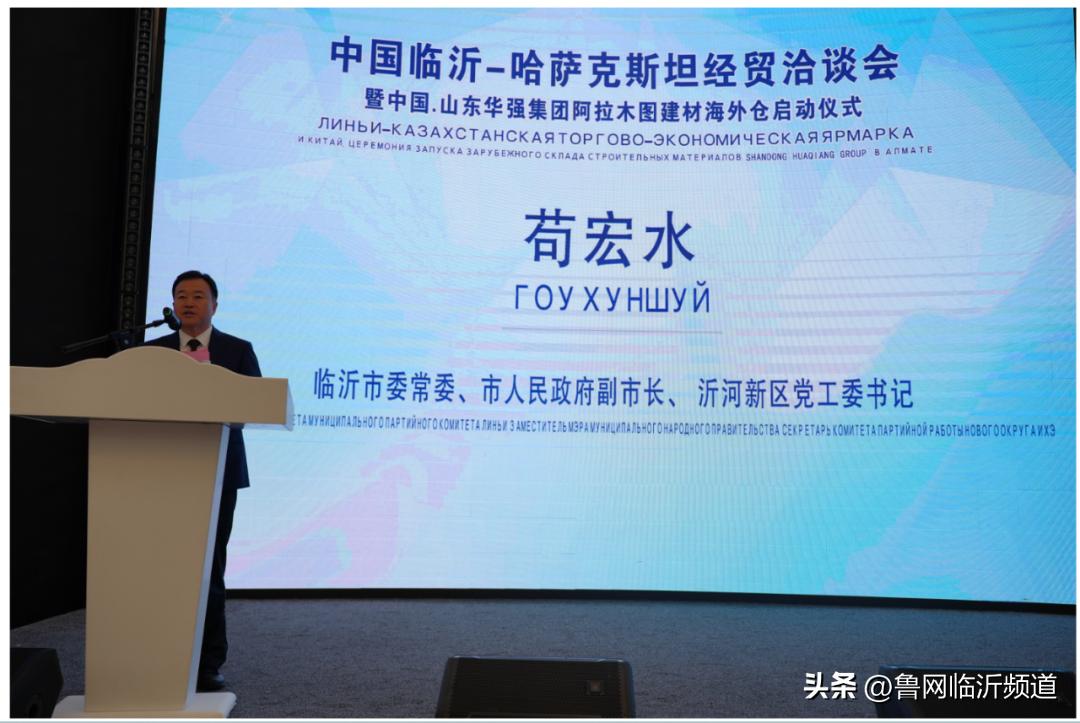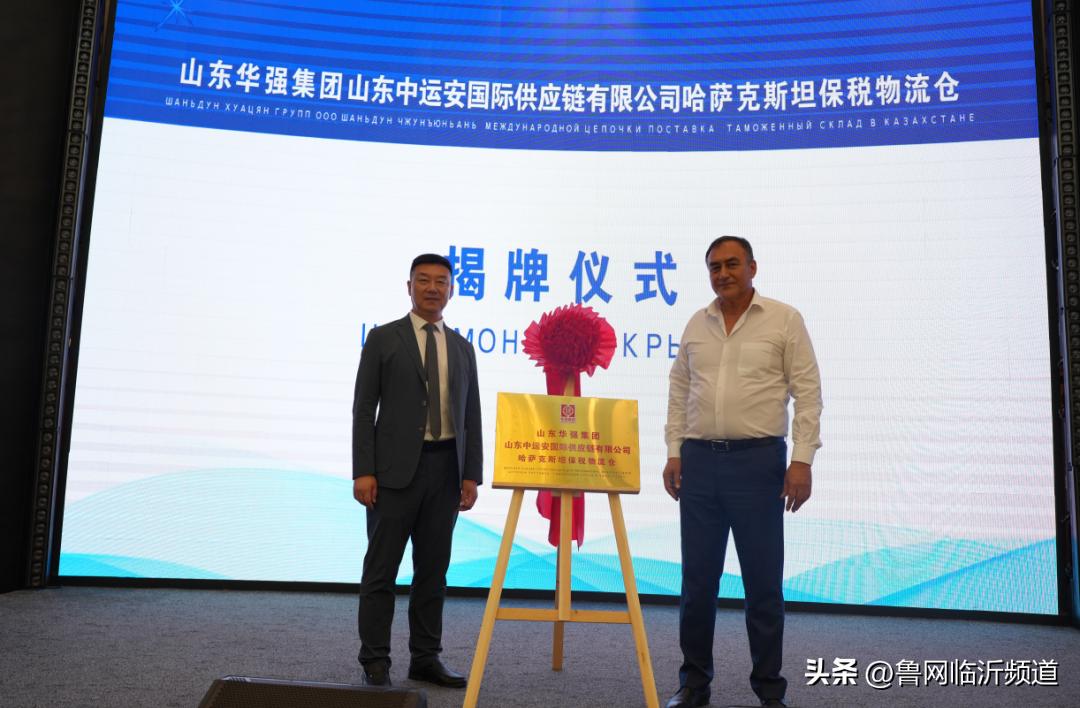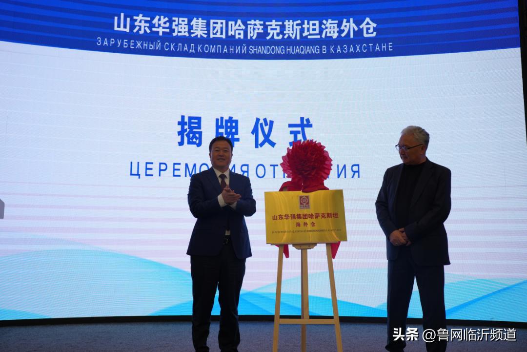 临沂市委常委、副市长,沂河新区党工委书记苟宏水与阿拉木图市图尔克斯区区长阿勒玛嘉别特夫.阿勒达别尔根上台为山东华强集团哈萨克斯坦海外仓进行揭牌。