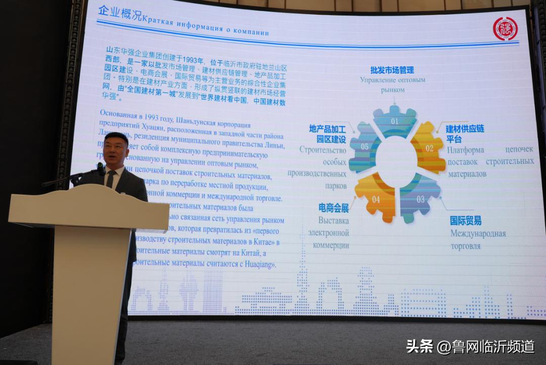 山东华强集团副总经理、华强国际贸易有限公司董事长、总经理王文刚作山东华强集团推介。王文刚表示,近年来,山东华强集团积极融入共建“一带一路”倡议,深入推进临沂商城国际化战略,坚定不移地推动建材产业“出海”,创新打造了“市场采购+跨境电商+海外仓”的外贸发展新模式,国际贸易实现快速增长,各项业务呈现出“面朝大海,春暖花开”的良好气象。山东华强集团与当地商协会共同建设的集展示交易+仓储配套服务+物流配套服务为一体的哈萨克斯坦阿拉木图建材海外仓项目,将加速推动华强集团外贸经济提质增效。今后,山东华强集团将继续发挥资源优势,与商户共享发展机遇,为临沂商城国际化发展注入新活力。