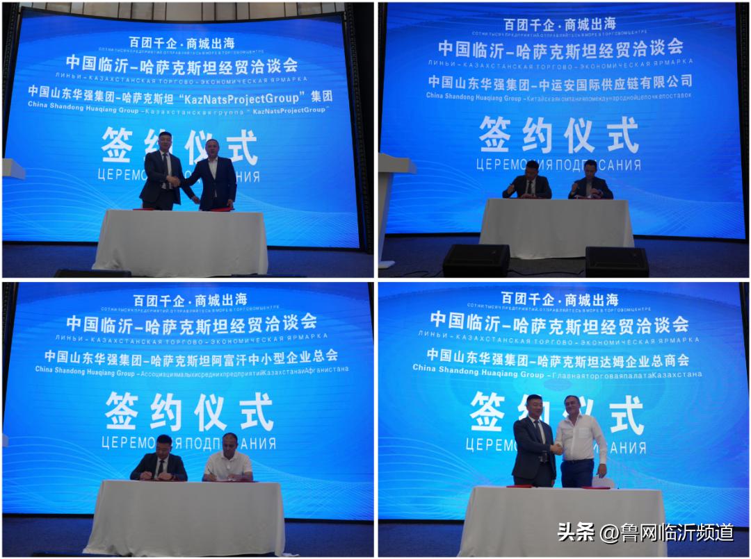 仪式上,山东华强集团与哈萨克斯坦国家项目集团公司,就临沂建材地产品海外仓签约;与哈萨克斯坦达姆企业总商会,就出口贸易战略合作签约;哈萨克斯坦阿富汗中小型企业总会,就进出口贸易战略合作签约;与中运安国际供应链有限公司,就装饰材料、洁具、型材、灯具、服装、五金电缆等出口签署战略合作协议。