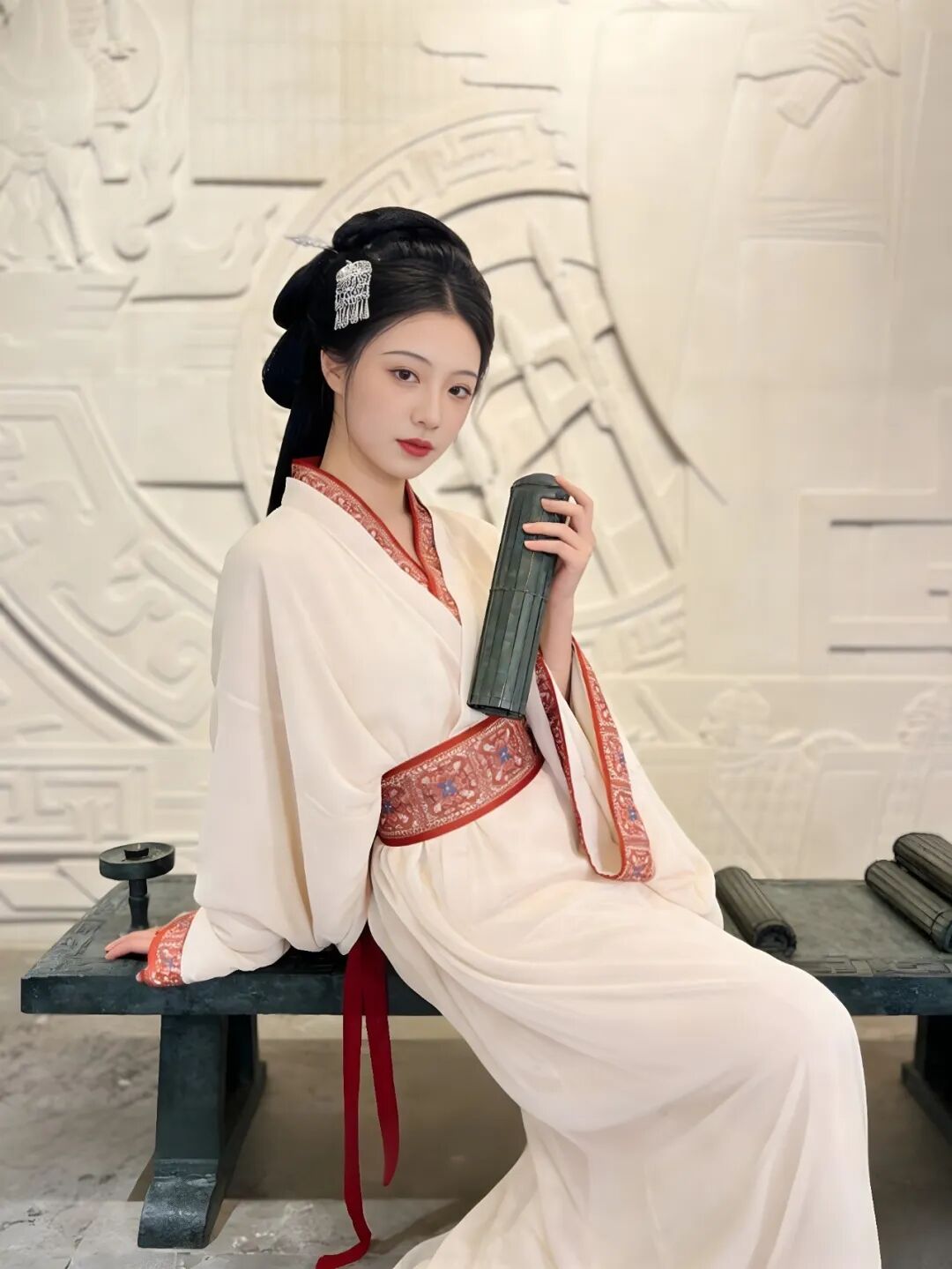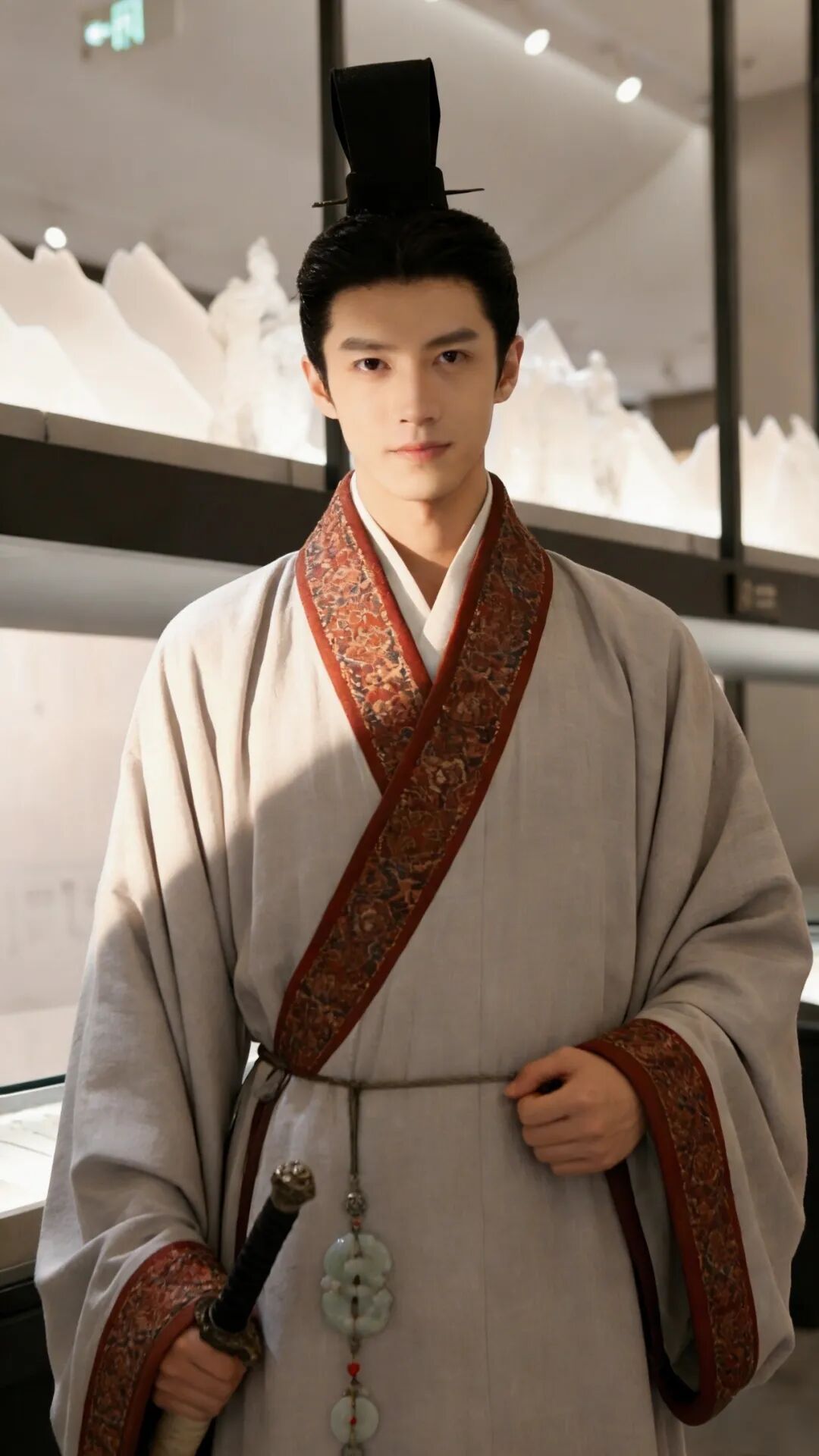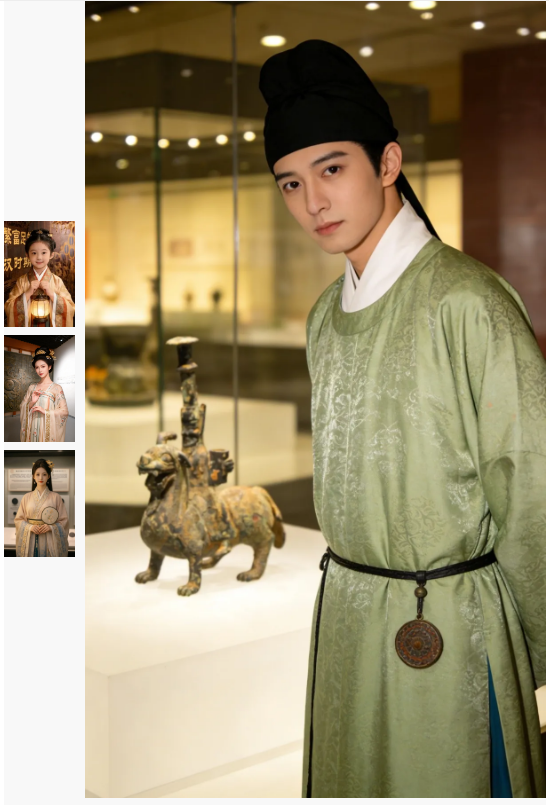 执扇回眸,衣袂翩然,似从汉画走来;佩玉垂缨,衣纹流转,暗合文物纹样。AI将你绘入千年风雅!