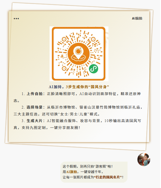 无论是临沂市博物馆的古珍遗风、银雀山汉墓竹简博物馆的汉墨书香,还是临沂孔庙的儒风雅韵,一键生成你的专属国风大片,朋友圈点赞直接破百!