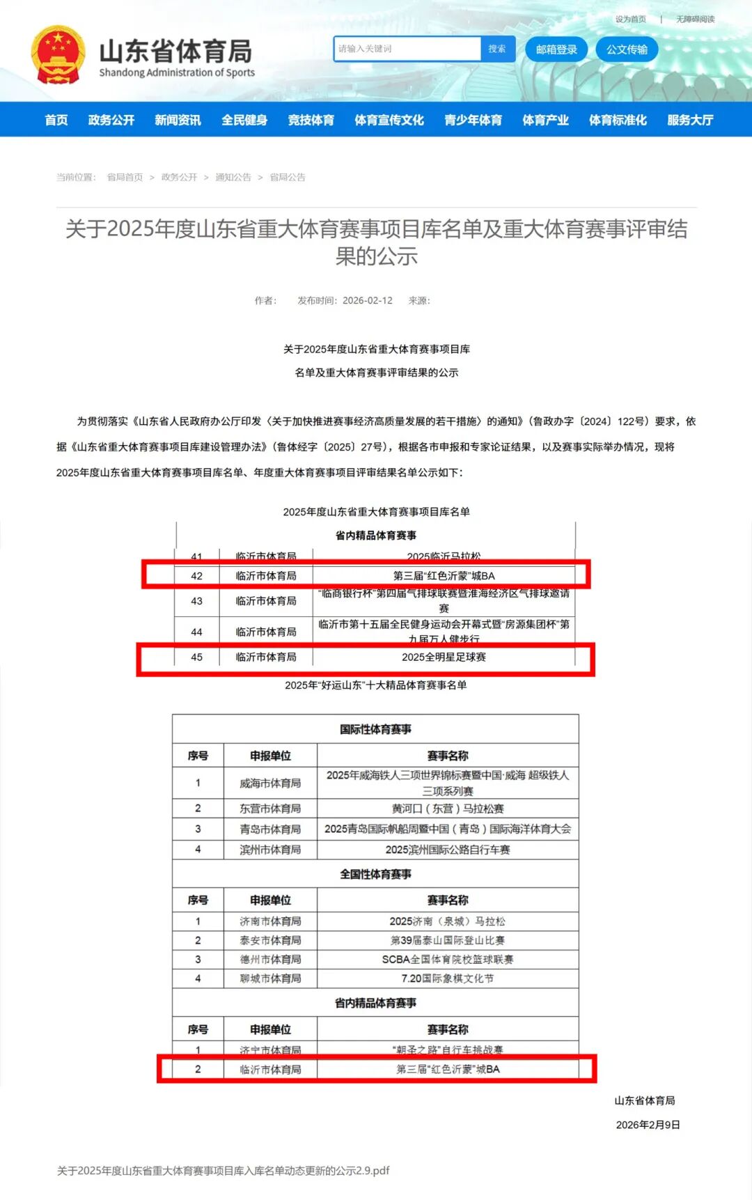 喜报!临沂多项精品赛事入选2025年度山东省重大体育赛事项目库