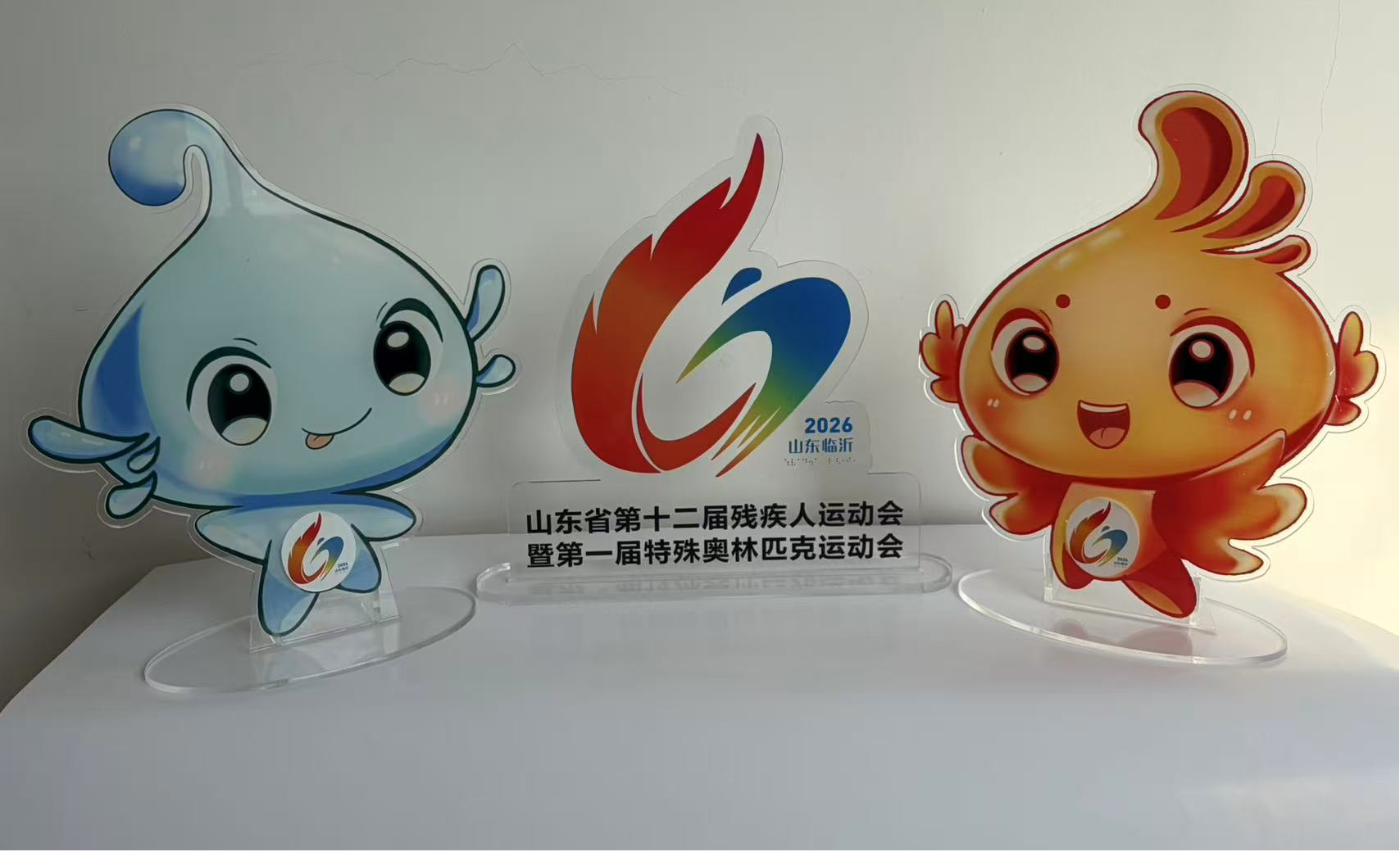 为体现资源集约、绿色节俭的办赛原则,本届省残特奥会与省运会共用同一对吉祥物,届时将印制本届赛会标识加以区分。吉祥物为一对活泼可爱的卡通形象,蓝色款取名“沂宝”,红色款取名“凤娃”。“沂宝”象征着临沂的母亲河—沂河,融合了蒙山沂水的自然风光和临沂的地域特色,五星形象和水滴形成的身体,既展现了其俏皮可爱的一面,也象征着繁星点点的愿景和纯洁的体育精神。“凤娃”是东夷文化中凤凰图腾的现代诠释,红色体现红色沂蒙的理念,它头顶凤羽和身负双翼的设计,不仅彰显了飞翔的自由与梦想,也代表了临沂人民的智慧和勇敢。“沂宝”与“凤娃”造型生动可爱又充满活力,既承载了临沂厚重的传统文化底蕴,又展现出临沂作为现代化城市时尚活力、追求卓越的崭新风貌。