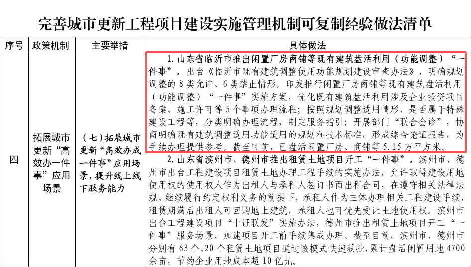 鲁网4月9日讯 3月26日,住房城乡建设部办公厅、自然资源部办公厅联合印发《住房城乡建设部办公厅、自然资源部办公厅关于印发完善城市更新工程项目建设实施管理机制可复制经验做法清单的通知》(建办厅函〔2026〕68号),临沂市闲置厂房商铺等既有建筑盘活利用(功能调整)“一件事”经验做法被纳入全国可复制经验做法清单,面向全国推广。