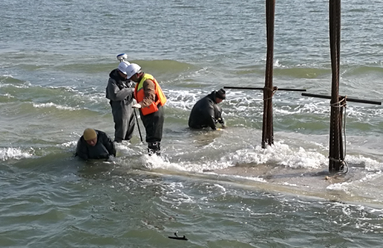 在青岛远洋学院航海训练基地项目,蔡博洋独立负责基槽挖泥、基床抛石、基床整平及方块安装工作,其中方块安装是工程的“重头戏”。在方块安装施工作业时,需工作人员提前到位等待,一旦方块落水,立即进行定位安装。时值冬季,寒风凌冽刺骨。风浪大、海域水位浅、方块体积大,加之每个潮位的有效工作时间仅有6小时左右,这无疑给施工带来了更大的挑战。