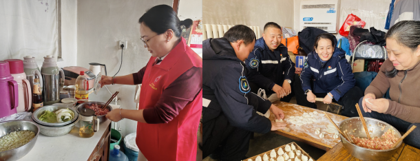 活动当日,志愿者们带着新鲜食材与慰问品来到独居老人家中。大家分工协作,揉面、调馅、擀皮、包饺子,动作娴熟,配合默契。大家一边忙碌,一边陪老人拉家常,询问老人的身体状况和生活需求,倾听老人讲述过往的故事,欢声笑语填满了整个屋子,驱散了冬日的寒意。