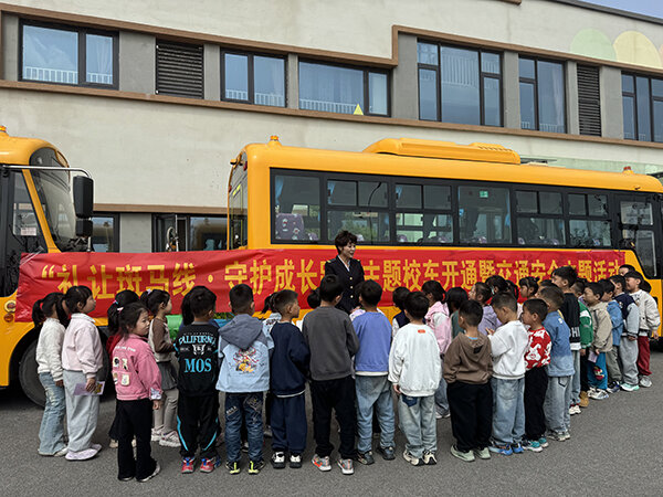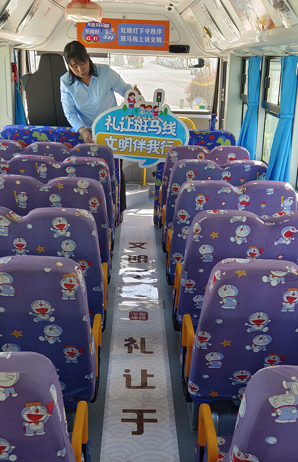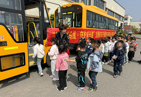 4月22日,在北安街道新安幼儿园内,印有“礼让斑马线 护航成长路”标志的主题校车正式投入运营,校车车身以醒目的黄色、蓝色为主色调,搭配卡通交通安全海报、“礼让斑马线 文明你我他”主题地标,引导幼儿在沉浸式体验中牢记“礼让斑马线 文明你我他”文明交通理念。