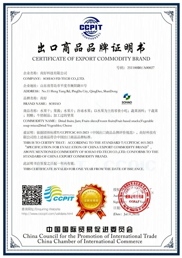 尚好科技有限公司位于平度市同和街道(衡阳路11号),以“尚善好德·质赢未来”为核心理念,深耕高端健康食品领域,打造出涵盖FD冻干果蔬、航空航天功能性食品等100多个品种的创新产品矩阵。作为“国家知识产权优势企业”和“新一代青岛金花”培育企业,其核心竞争力源于强大的科技基因,拥有国内领先的智能化5G冻干工厂、国家级实验室,并获得美国FDA、欧盟BRCGS等数十项国际认证,产品畅销北美、日韩及欧盟。
