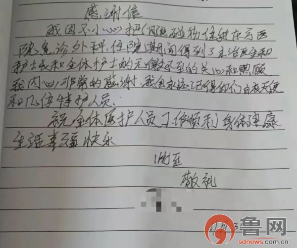 出院当天,护士长帮患者换上干净的衣物,准备好崭新的拐杖,耐心叮嘱他出院后的注意事项,反复告知他日常防护与饮食禁忌。看着身上整洁的衣物,感受着医护人员无微不至的关怀,患者紧紧握着护士长的手说:“我内心无比感激,在东方医院我遇到了很多好人,护士每天悉心地护理,护士长亲切的问候,大夫为我签担保协议,政府为我出钱治病,大家都在积极地帮助我,让我能很好地恢复!胶州真是一个充满人情味的地方!”患者留下感谢信一封,承载着最深的感动;平凡的瞬间,定格着医者的大爱。