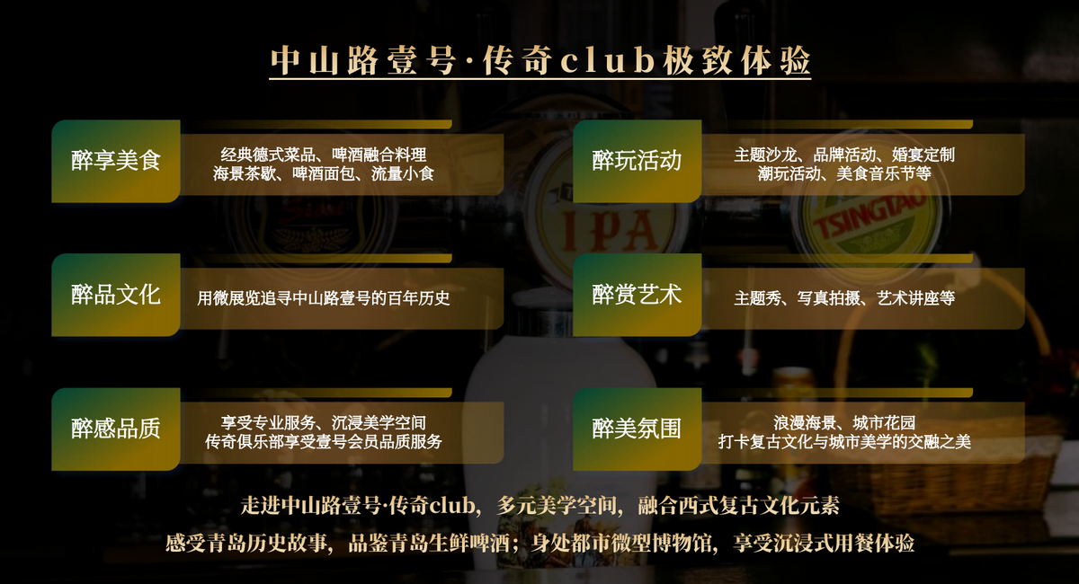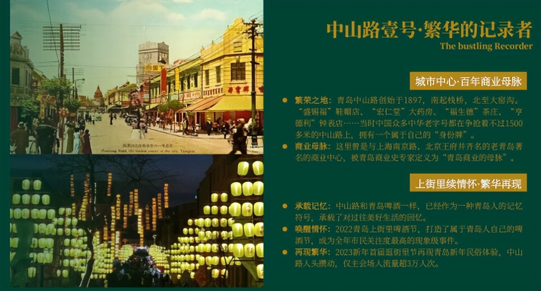 如今,中山路成为一个集文化、艺术、商业、旅游等业态于一体的特色街区。繁华的背后,是市南区推进城市更新建设的厚积薄发。推进以中山路区域为主的历史城区保护更新,让历史悠久的中山路焕发新的生机与活力。位于中山路的中山路壹号·传奇CLUB是建于1910年的青岛国际俱乐部旧址,过去是最繁华的商业地标。如今,华丽变身成为集创意文旅、特色餐饮、潮流艺术和休闲生活于一体的岛城首家实景沉浸式文旅商业综合体。