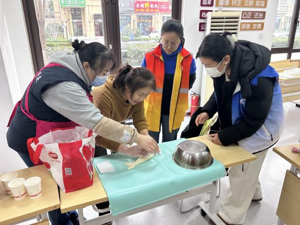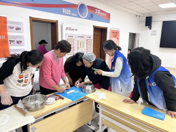 本次活动邀请专业面塑老师现场教授居民们花馍的塑造与蒸制技艺。老师先是从原材料选取、制作技巧、温度和时间等各方面向居民们细心讲解了做花馍的基本流程。随后,带领大家一起和面、揉面,并进行面塑教学。在她的巧手操作下,不一会一个个精致小巧的枣饽饽、面鱼和福袋便呈现在了大家面前,配合着灵活的实操,老师对制作面塑时不同的手法,如捏、搓、揉、刻、划等展开了详细介绍。