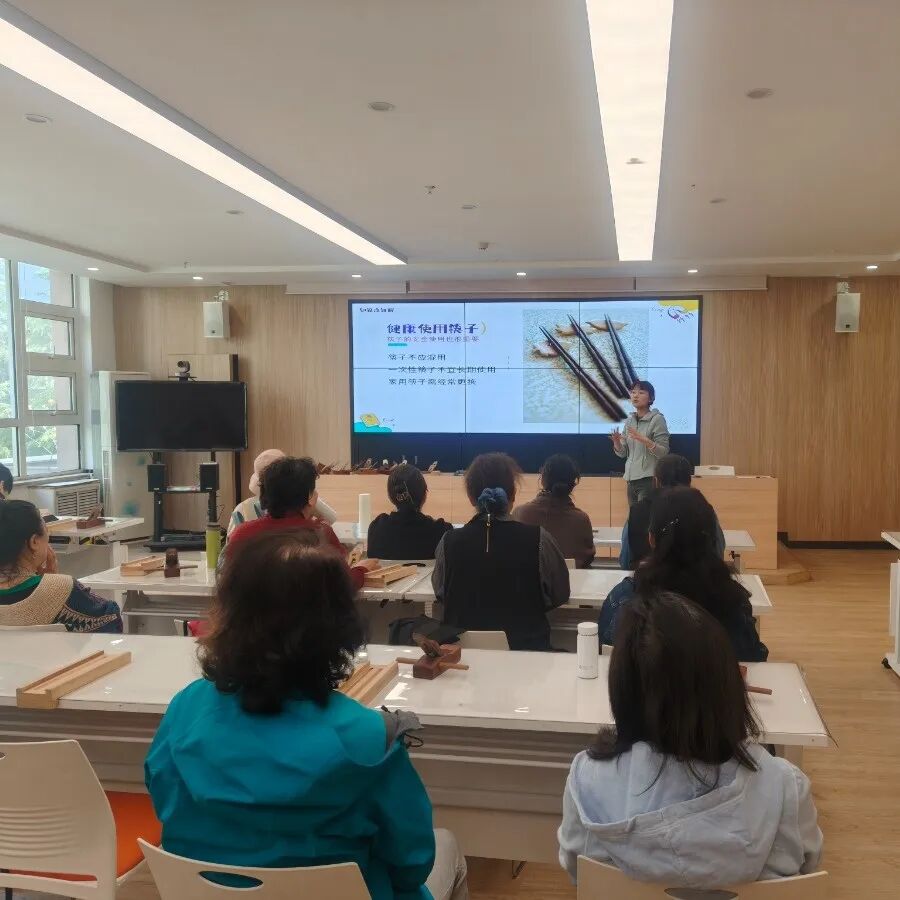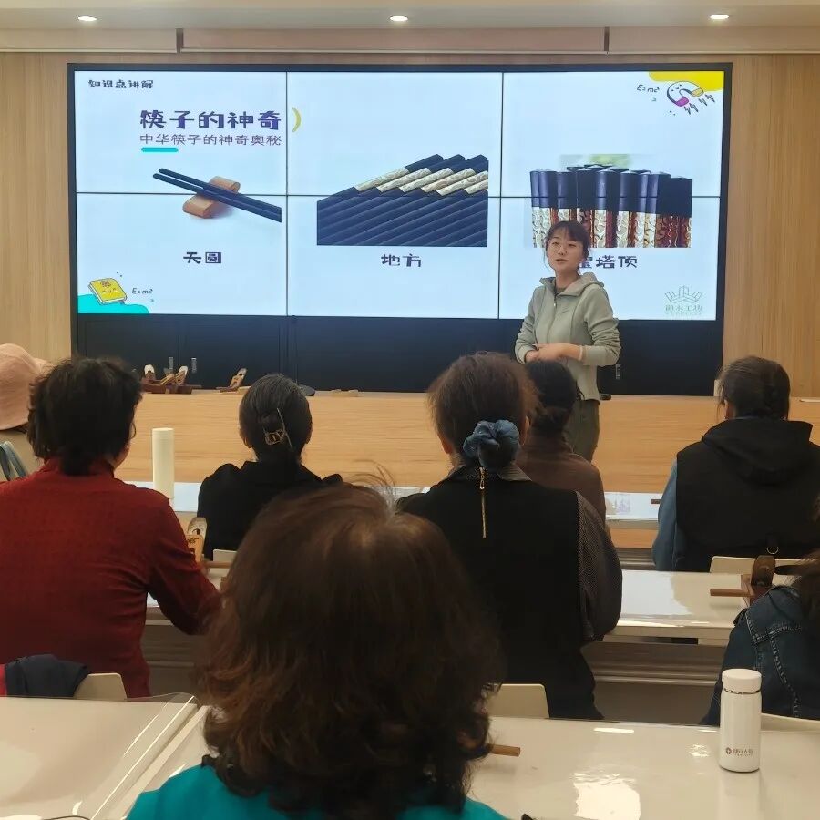 活动现场,老师首先为居民们深入讲解了筷子的历史与发展。筷子作为华夏饮食文化的标志之一,有着悠久的历史,其发明于中国,承载着中华优秀传统文化,蕴含着丰富美好的寓意。筷子的形状一端为方形,一端为圆形,寓意着“天圆地方”,象征着天地和谐共生;传统筷子的长度为七寸六分,象征着人的“七情六欲”,而成双出现的筷子,则代表了阴阳调和、和谐共生的理念。