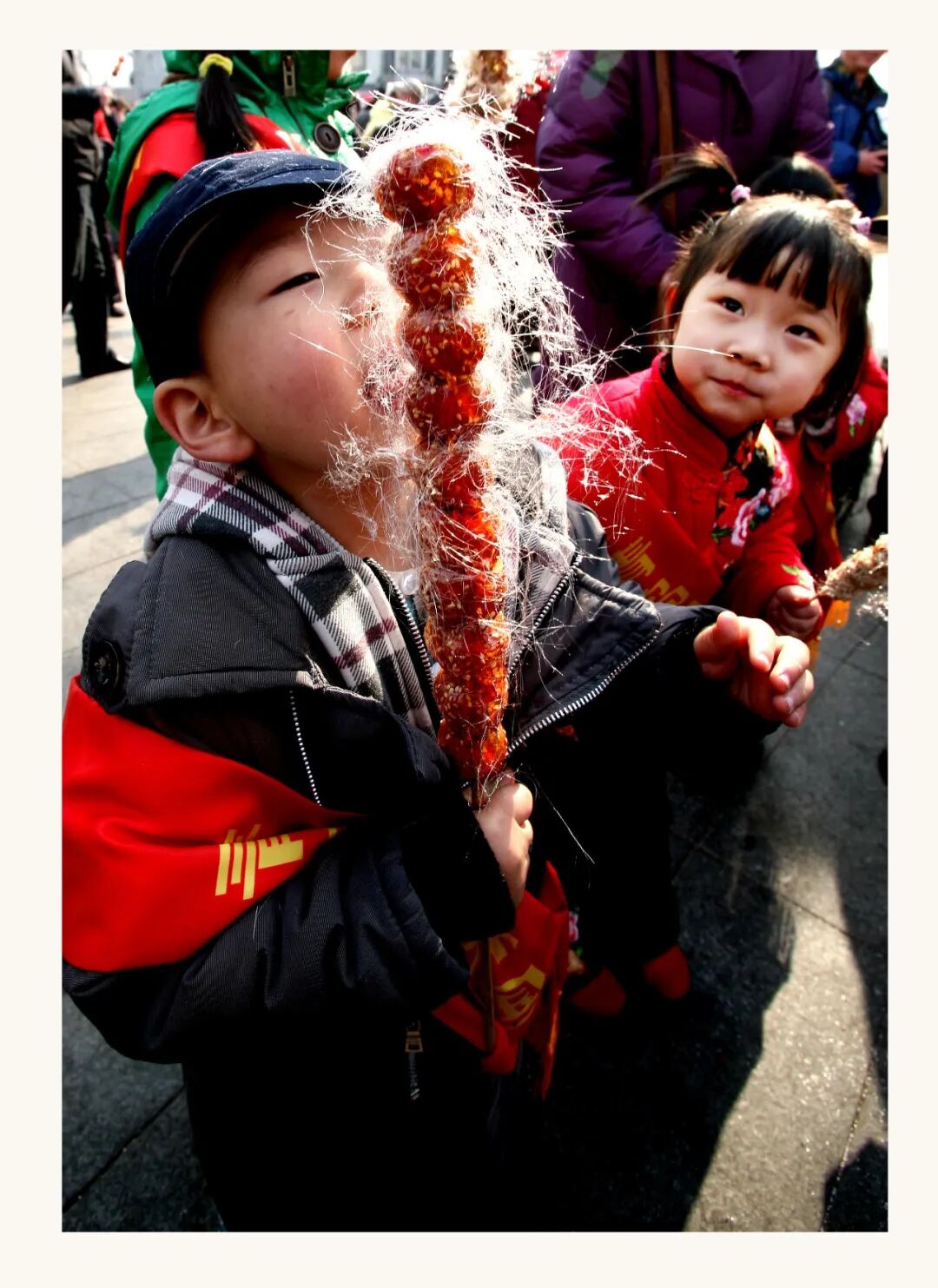 每年糖球会,最动人的莫过于孩子们的笑脸。这些年,镜头定格下无数捧着糖球、眉眼弯弯的小朋友,他们或踮脚接糖球、或欢喜打量花式糖球,这些瞬间凝成老照片,藏着市北的烟火温情与一代人的糖球记忆。