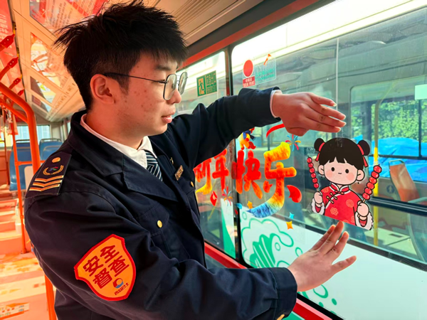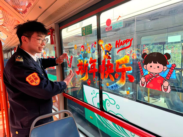 2路公交车的驾驶员刘佳伟,为了营造浓厚的节日气氛,精心装饰了车厢,贴上了与糖球会相关的传统民俗文化图案,让车厢焕然一新。走进车厢,红灯笼、剪纸窗花、卡通糖球图案装饰点缀其间,车窗上贴着大鲍岛历史文化街区的老照片和新春祝福语。不少乘客一上车便拿出手机拍照:“还没到会场,先感受到了过年的热闹”。