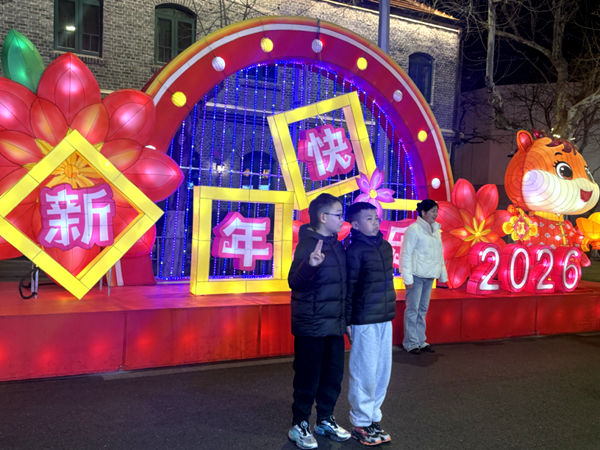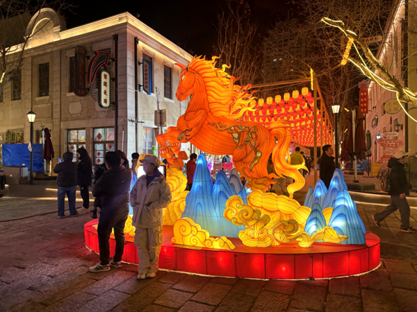 马年主题灯组马踏祥光气势恢宏,鎏金骏马昂首扬蹄、身姿矫健,周身环绕祥云、流光灯带,灯光渐变间仿佛踏云而行,寓意丙午马年马到成功、前程似锦。灯组与里院青砖黛瓦相映成趣,既彰显生肖文化底蕴,又传递新春吉祥祝福,不少市民携家人在此合影,定格马年新春的美好瞬间。