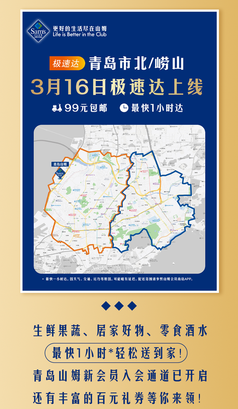 千呼万唤,3月16日,青岛山姆极速达服务已上线,覆盖市北、崂山部分区域,范围内的小伙伴们今天就可以在家手机下单,动动手指山姆好物最快1小时*送到家~更多极速达覆盖区域即将上线,还未覆盖的小伙伴可以使用全国配服务,品质好商品也能送货上门!