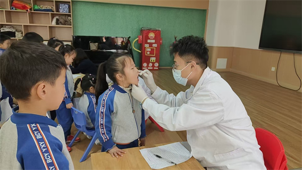 查体现场,孩子们在老师的有序引导下排队等候,脸上洋溢着好奇与期待。医护人员身着白大褂,耐心细致地为每一位孩子进行全面检查。