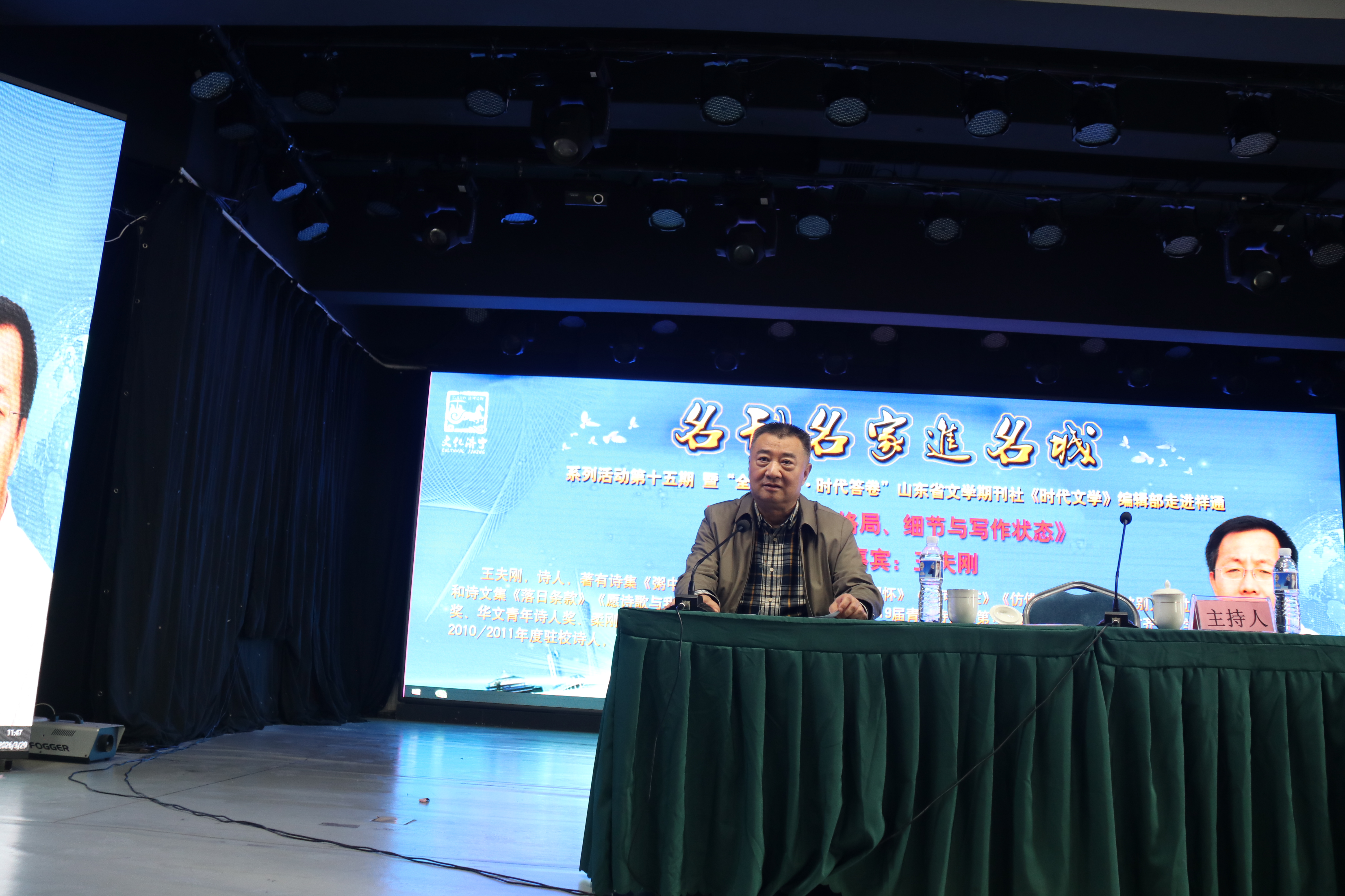 鲁网4月1日讯 3月29日,“名刊名家进名城”系列活动第15期暨“全民阅读·时代答卷”山东省文学期刊社、《时代文学》文艺志愿者小分队走进济宁活动,在祥通集团演播大厅如期举行。本次活动邀请《诗刊》编辑蓝野、中国诗歌网编辑王夫刚两位名家名编走进孔孟之乡,专题授课。济宁学院党委副书记丰家雷(山东省作协会员),孟子研究院原党组书记、院长陈晓霞(中作协会员),济宁市应急救援支队副支队长井源(省作协会员),济宁市作协主席张建鲁,济宁报业传媒集团副总经理满涛(省作协会员),市作协副主席王黎明、孙继泉、柏祥伟、纪广洋、周中祥,副秘书长纪秀目、孙本广,创联部副主任王磊;市读书协会长郭玉(市作协会员)、副会长商敬洲(市作协会员),市作协诗歌委员会、济宁学院作家协会、市读书协会的会员代表及各县(市区)作协主要从事诗歌创作的会员代表等80余人现场参加活动,共同感受诗歌创作动人心弦的魅力,开启诗歌与时代的深情对话。活动由市作家协会副主席、市作协诗歌委员会主任田暖主持。