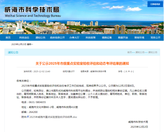 近日,2025年威海市重点实验室验收评估和动态考评工作已经完成,威海市科技局官网将结果予以公示。荣成经济开发区3家企业通过2025年威海市重点实验室验收评估和动态考评工作。