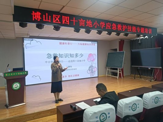 3月30日,淄博市博山区四十亩地小学特邀博山区医院急诊科王静怡医生开展急救知识专题培训,全校师生通过 “理论讲解 + 实操演练”的形式,系统学习实用急救技能。