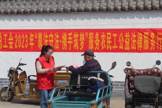 济宁市微山县韩庄镇总工会组织新时代文明实践志愿者走进郗山古村送戏下乡演出现场组织开展2023年“尊法守法·携手筑梦”服务农民工公益法律服务行动。