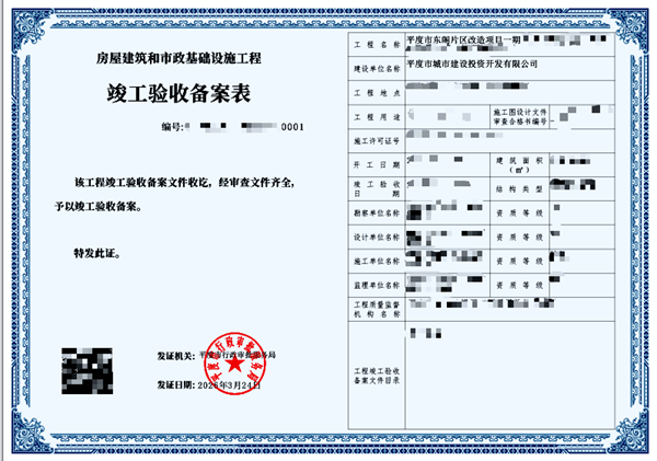 日前,平度市行政审批服务局为平度市城市建设投资开发有限公司承建的东阁片区改造项目一期、二期,成功核发全市首张房屋建筑和市政基础设施工程竣工验收备案表电子证照。