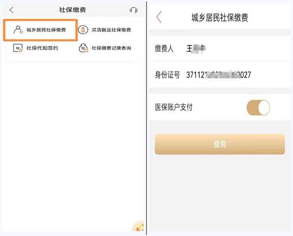 第二步,点击“城乡居民社保缴费”,录入需缴费的被绑定的家庭共济成员姓名、身份证号,选择“医保账户支付”,点击“查询”;