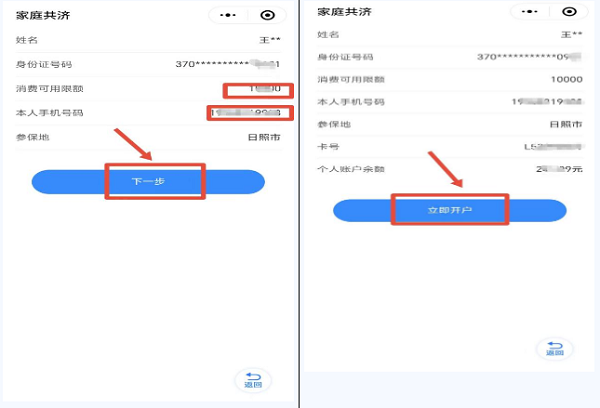 第三步,建立个账共济账户。点击“建立我的个账共济账户”,输入消费可用限额、本人手机号码,点击“下一步”,确认家庭共济相关信息后点击“立即开户”。