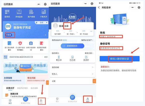 第一步,登录“日照医保”小程序。打开微信首页,搜索“日照医保”小程序,并点击进入。首次登录需填写个人信息,并进行人脸识别认证;