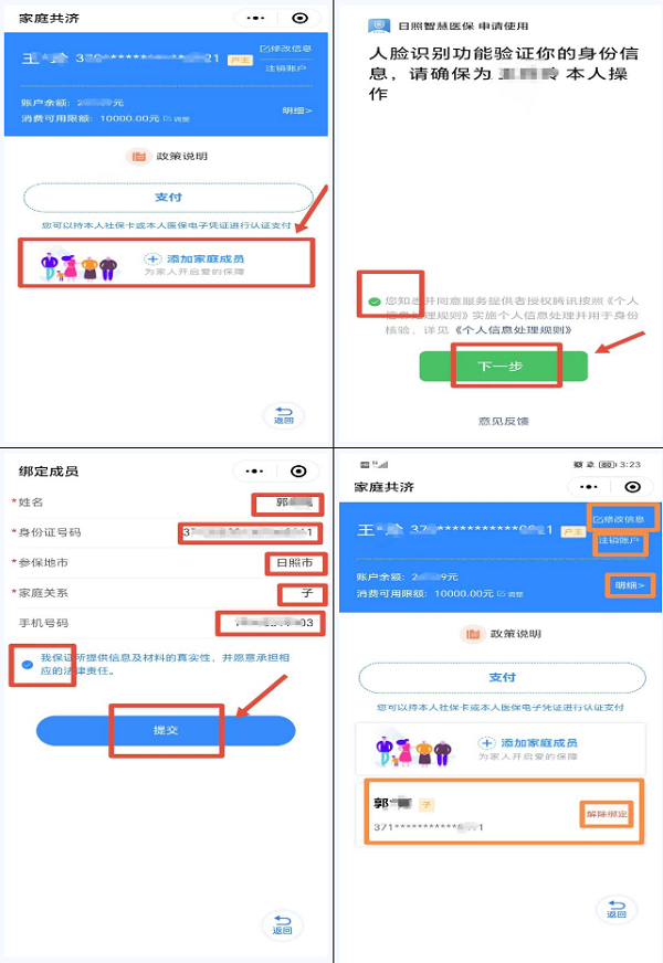 第四步,绑定家庭成员。点击“添加家庭成员”按钮,参保职工通过人脸认证校验身份信息,进入绑定成员信息录入页面,录入信息并勾选承诺书,点击提交即绑定成功。