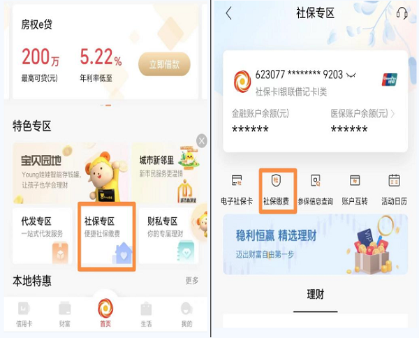 第一步,登录“日照银行”APP,进入首页,点击“社保专区”-“社保缴费”;
