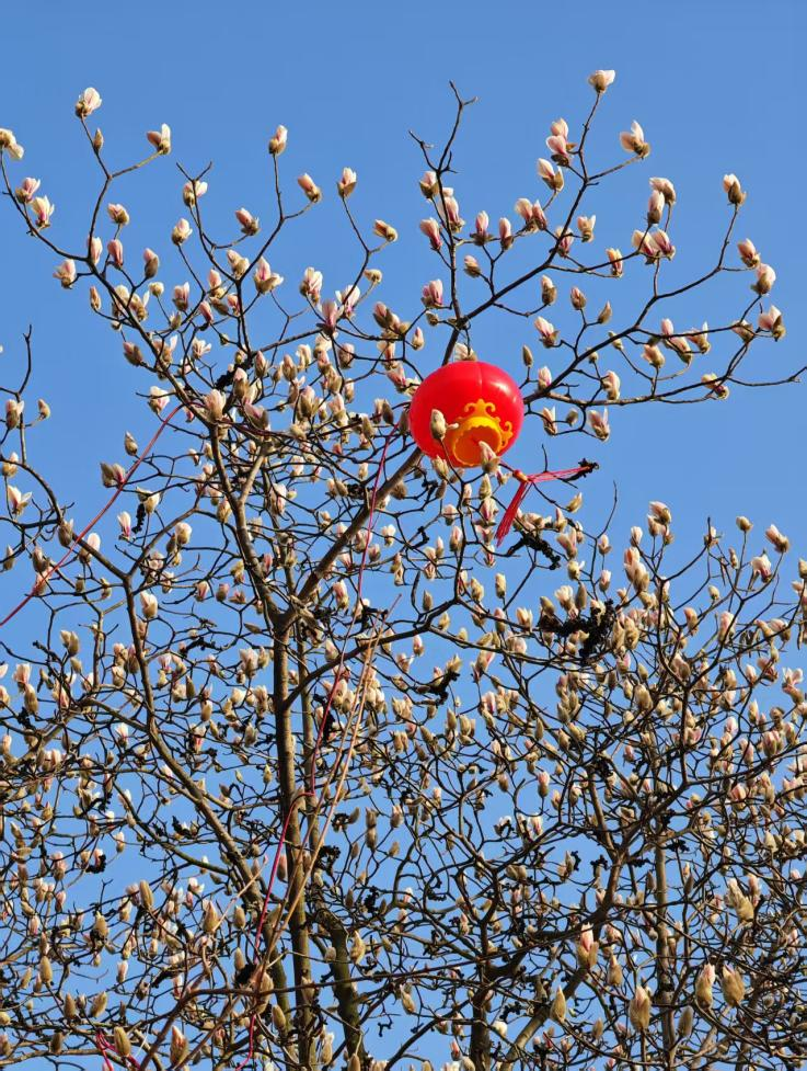 蓝天衬着满树玉兰花苞,喜庆的红灯笼坠在枝间。郭宝安 摄