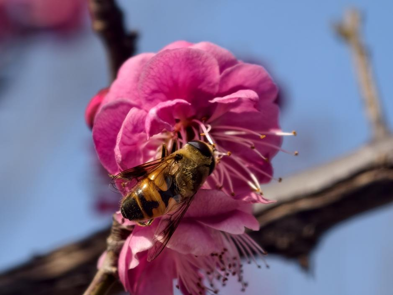 艳粉的花盏盛满春光,蜜蜂裹着暖阳扎进花心。宋年升 摄