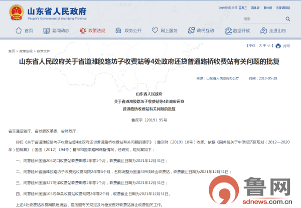 据悉,山东省人民政府依据《国务院关于中原经济区规划(2012—2020年)的批复》精神和国家路网调整情况,同意延长国道206龙口收费站收费期限2年零1个月;延长省道潍胶路坊子收费站收费期限2年零6个月,名称调整为国道309线峡山收费站;延长国道327菏泽收费站收费期限2年零1个月;延长国道105线单县收费站收费期限2年零2个月,以上4个收费站收费截止日期均为2021年12月31日。
